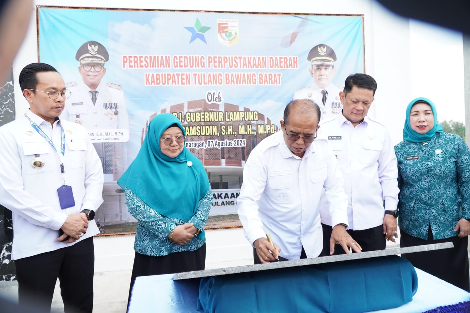 Dilanjutkan pada Pukul 13.15 siang, Pj gubernur melakukan penandatanganan prasasti dan menggunting pita tanda diresmikannya Gedung Perpustakaan Daerah Tubaba di Tiyuh Pulung Kencana, Kecamatan Tulangbawang Tengah. Dan dilokasi yang tidak jauh itu juga dilakukan peletakan batu pertama pembangunan calon kantor Badan Pertanahan Nasional (BPN) Tubaba.