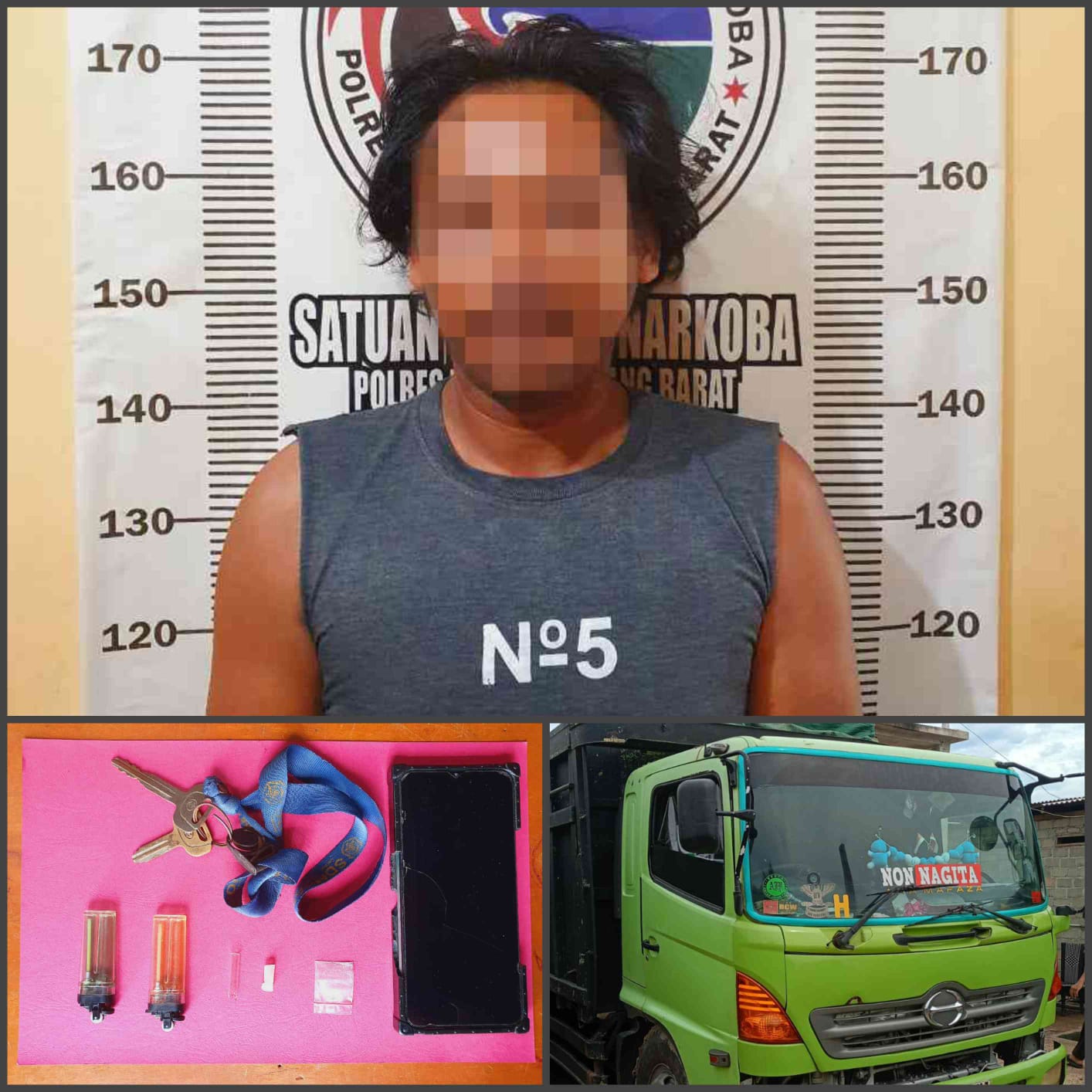 “Selain mengamankan terduga pelaku, anggota juga menyita barang bukti berupa : 1 (satu) bungkus plastik klip kecil yang berisi di duga narkotika jenis Shabu 1 (satu) buah tabung kaca pirek bekas residu, 2 (dua) buah korek api gas, 1 (satu) buah penyambung kaca pirek, 1 (satu) unit handphone merk realme c11 warna hijau, 1 (satu) unit mobil merk Hino fuso warna hijau.