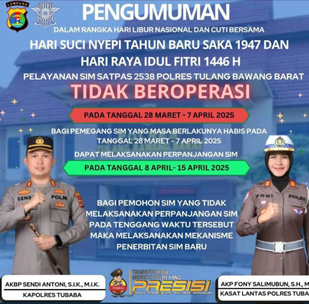 Kasat Lantas Polres Tubaba Akp Fony Salimubun, S.H, M.H. mewakili Kapolres Tulang Bawang Barat AKBP Sendi Antoni, S.I,K., M.I.K, mengimbau masyarakat yang memiliki SIM atau Surat Tanda Nomor Kendaraan (STNK) yang masa berlakunya habis pada periode libur tersebut agar tidak khawatir. “Bagi masyarakat yang masa berlaku SIM habis pada tanggal 28 Maret hingga 7 April 2025, dapat melakukan proses perpanjangan pada tanggal 8 hingga 15 April 2025 sedangkan untuk proses perpanjangan STNK pada 8 dan 9 April 2025 tanpa dikenakan denda keterlambatan,” jelas