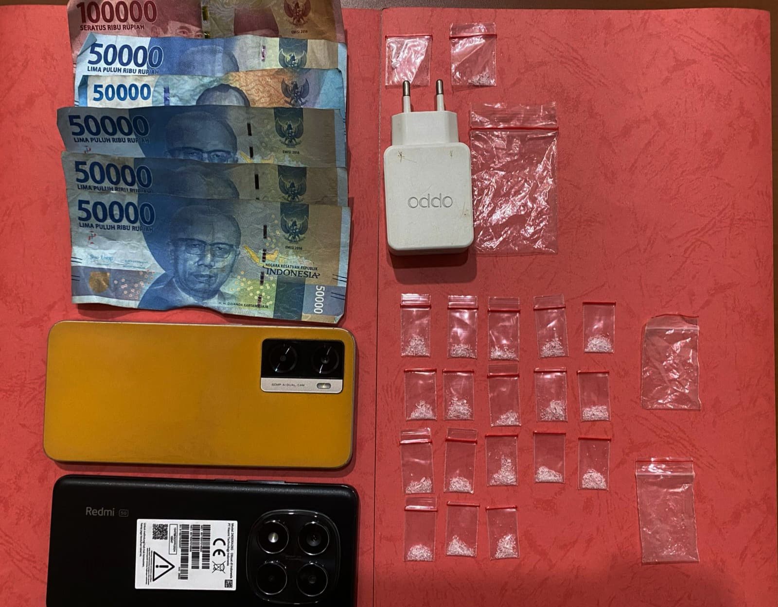 Selain itu, juga turut disita barang bukti (BB) berupa 2 (dua) bungkus plastik klip ukuran sedang dan 18 (delapan belas) bungkus plastik klip ukuran kecil yang berisi narkoba jenis sabu dengan total berat bruto 2,69 (dua koma enam puluh sembilan) gram, plastik klip ukuran besar kosong, plastik klip ukuran sedang kosong, kepala charger handphone (HP) merek Oppo, HP merek Oppo warna kuning, HP merek Redmi warna hitam, dan uang tunai sebanyak Rp 350 ribu.