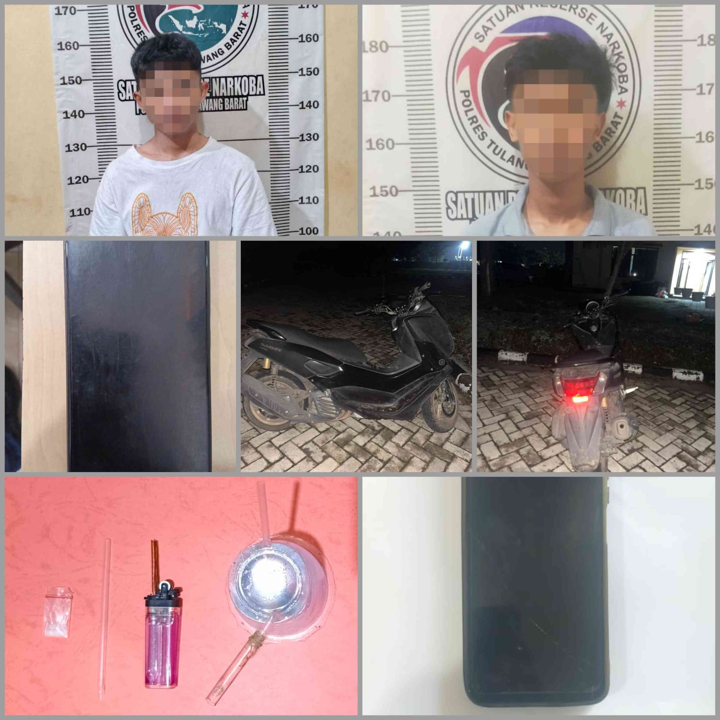 “Kedua tersangka tertangkap tangan memiliki barang yang diduga narkotika dan menyita barang bukti berupa : 1 (satu) bungkus plastik klip bening yang berisi di duga narkotika jenis Shabu, 1 (satu) buah alat hisab shabu (bong), 1 (satu) buah korek api gas yang masih terpasang sumbu pembakar, 1 (satu) buah sendok shabu yang terbuat dari selang pipet, 1 (satu) unit sepeda motor Yamaha N-max warna hitam, 1 (satu) unit handphone android merk VIVO y20t warna biru, 1 (satu) unit handphone android merk realmi c55 warna hitam, Kedua Remaja tersebut telah diamankan beserta barang bukti untuk proses hukum lebih lanjut,” ujar Yelva