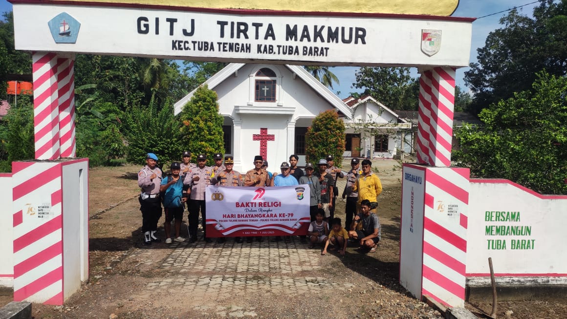 Ungkapfaktanews.com, Tulang Bawang Barat- Dalam rangka menyambut Hari Bhayangkara Polri ke-79, jajaran Polsek Tulang Bawang Tengah, Polres Tubaba, Polda Lampung melaksanakan kegiatan Bhakti Religi yang digelar di Masjid Baitul Huda, Pura Dharma Agung, Gereja injili di tanah Jawa (GITJ) Tiyuh Tirta Makmur Kec. Tulang Bawang Tengah Kab. Tulang Bawang Barat, Rabu (17/06/2026) Pagi