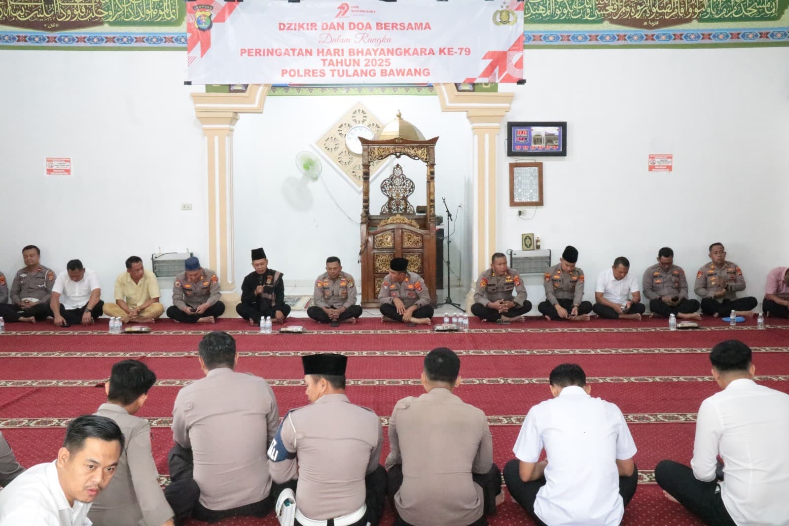 Kegiatan zikir dan doa bersama untuk menyambut peringatan Hari Bhayangkara Ke-79 Tahun 2025 yang digelar oleh Polres Tulang Bawang ini berlangsung hari Kamis (19/06/2025), pukul 08.30 WIB s/d selesai, di Masjid Darussalam, Kampung Lebuh Dalem, Kecamatan Menggala Timur, Kabupaten Tulang Bawang.