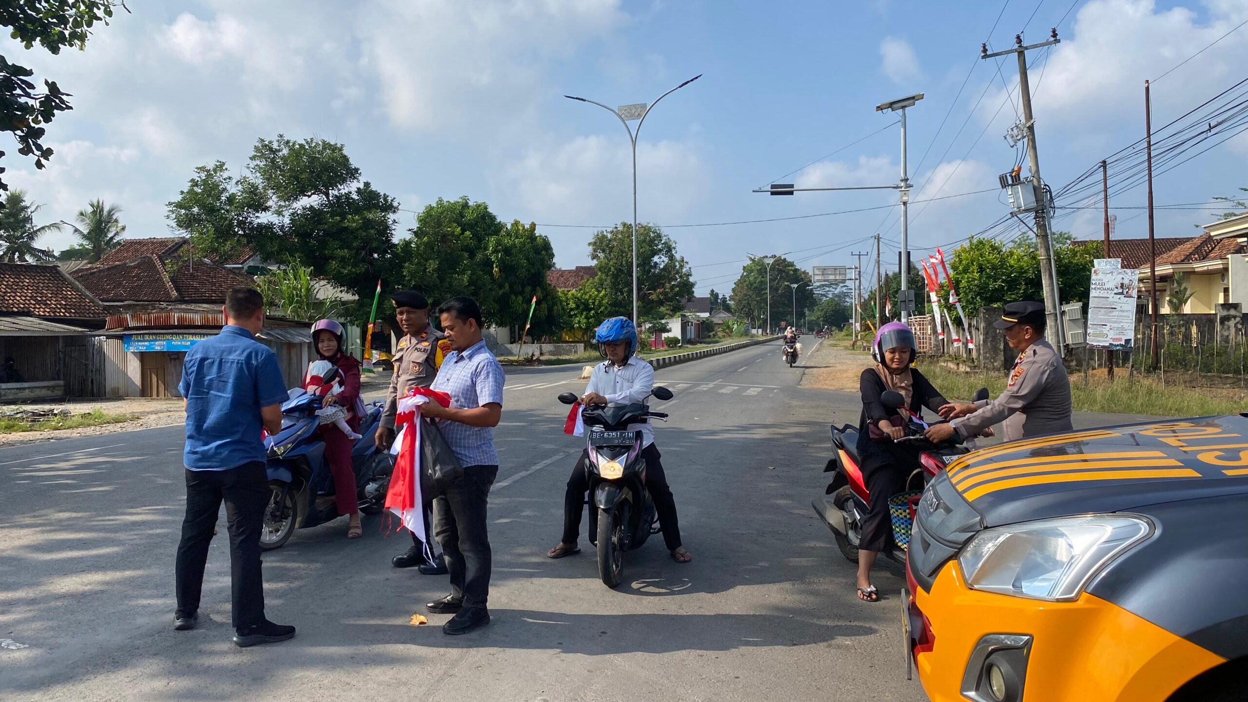 Dengan senyum ramah dan humanis, Kasat Intelkam bersama jajarannya memasangkan Bendera Merah Putih di kendaraan masyarakat yang melintas.
